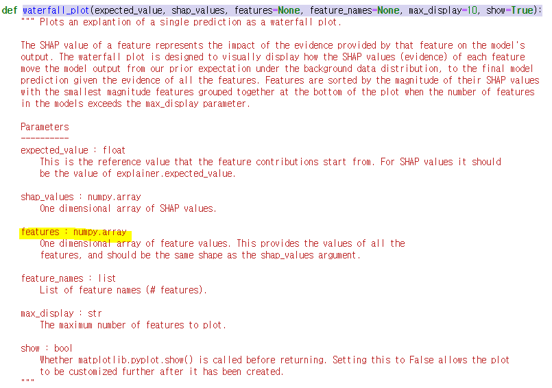 summary plot이나 dependence plot에서는 문제가 없었다. 그래서 함수 코드를 보니, 아래 첨부된 사진처럼 features 자리에 array형식의 데이터가 들어가야 한다고 설명되어있다.