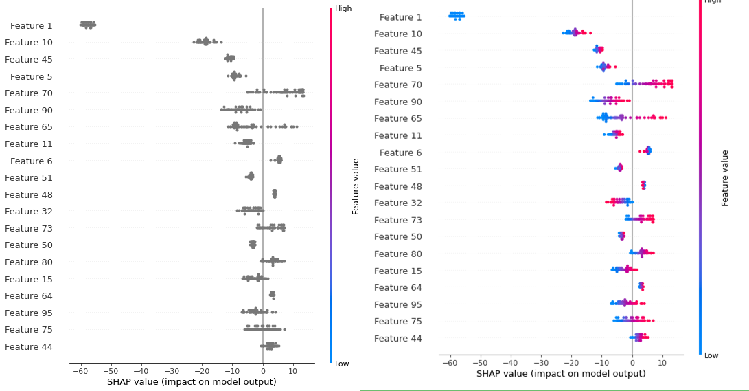 torch에서 DNN모델을 만들고, 해석을 위해 가장 먼저 summary plot을 뽑는데, 이제껏 잘 나오던 것이 회색 도트로 찍히면서 애를 먹였다. 오른쪽 그림(정상그림)처럼 컬러가 표시가 되어야 하는데 왼쪽 그림(회색컬러플롯)처럼 feature값이 반영이 안되는 문제가 발생했다.