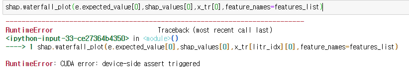하지만 shap 에서 waterfall plot 함수를 사용하는데 CUDA Error가 났다.